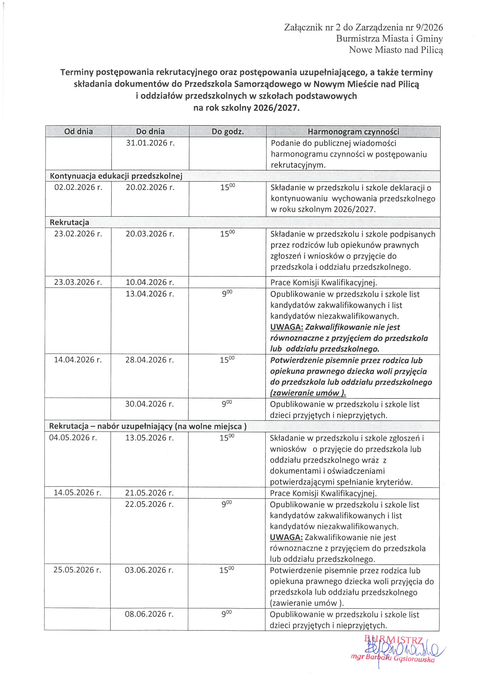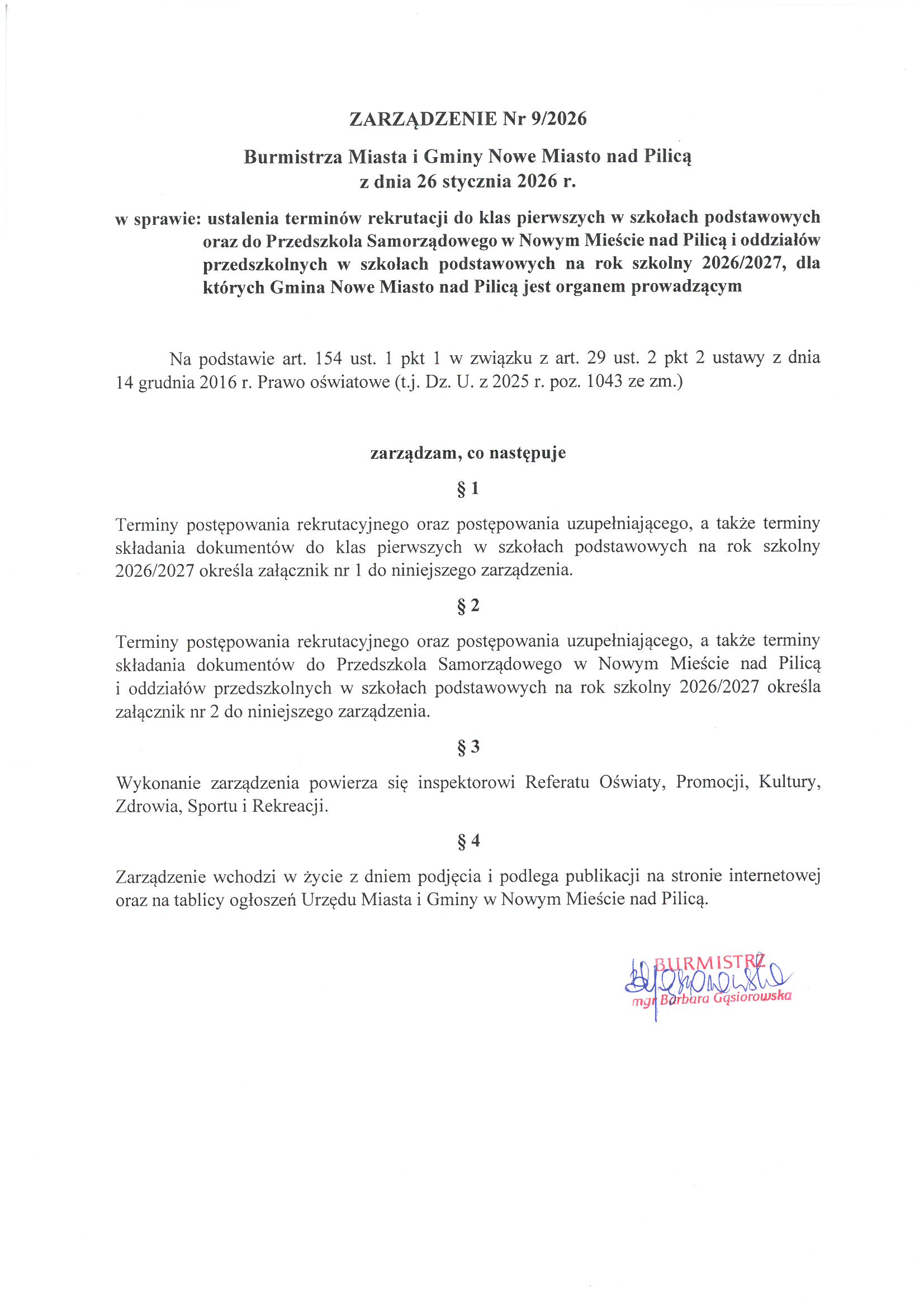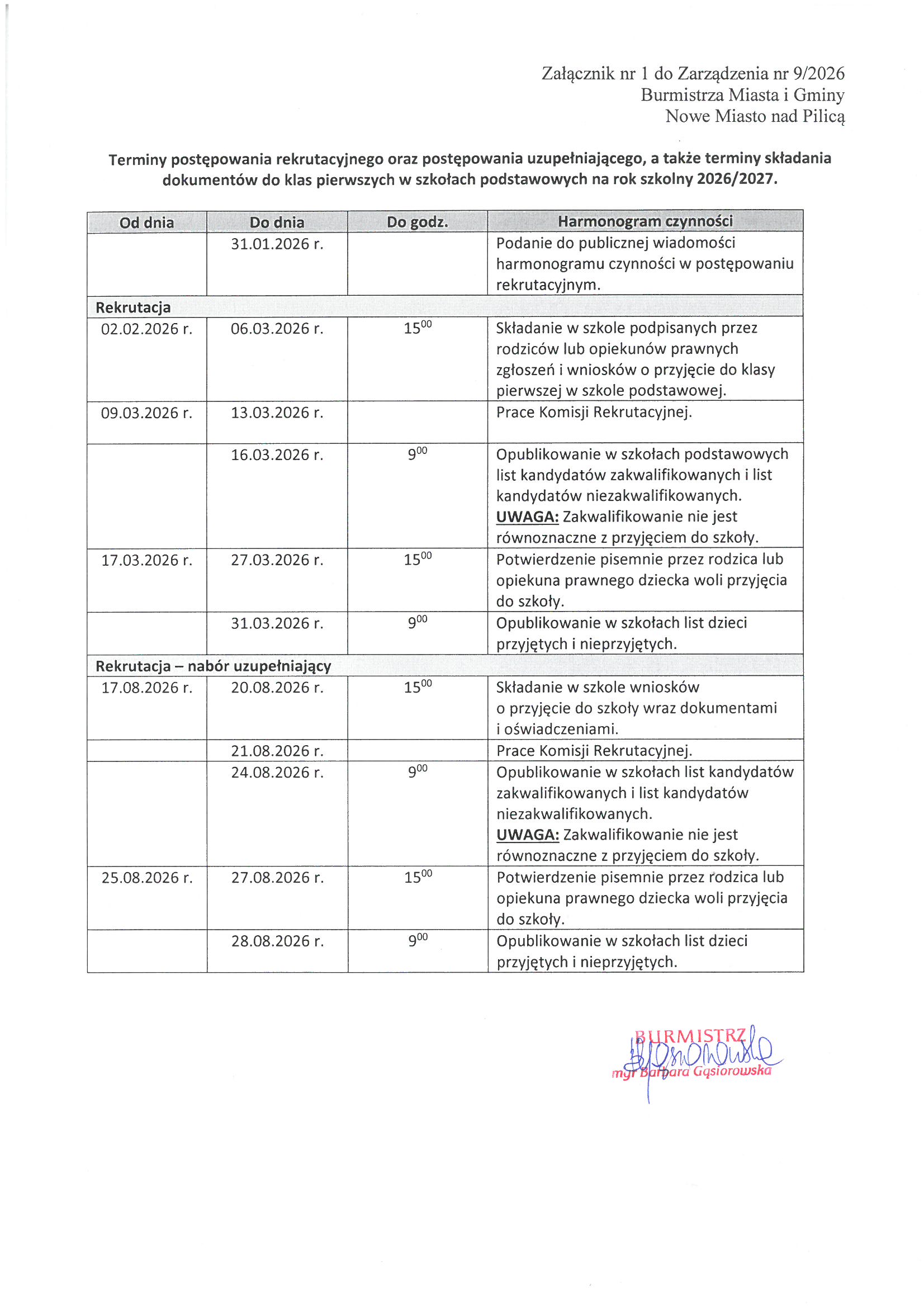 Ogłoszenie - terminy rekrutacji do klas pierwszych, przedszkola i oddziałów przedszkolnych na rok szkolny 2026/2027.